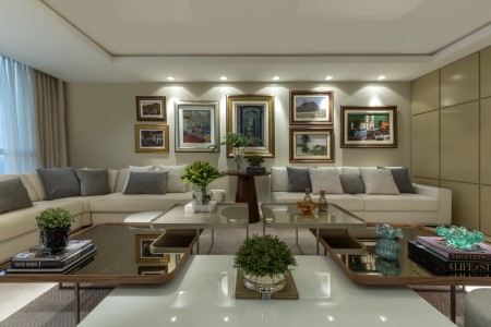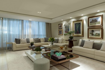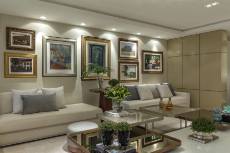 O living recebeu sofás, pufes e mesas componíveis. Todos os quadros do acervo de obras de arte do casal foram incorporados na decoração, trazendo personalidade para o projeto.