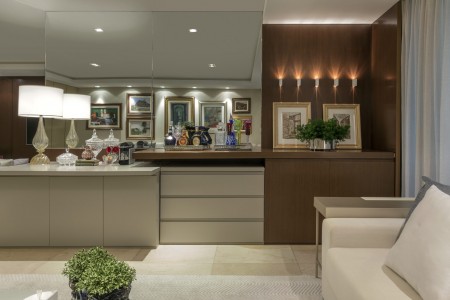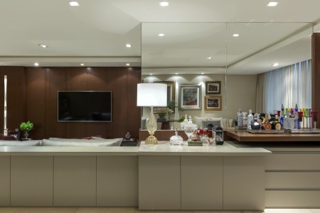 A integração do jantar ao living, à varanda e à sala de TV surgiu como alternativa para melhorar a circulação e garantir espaços amplos para as recepções que o casal adora promover. Equipamentos como adega, máquina de café expresso e frigobar foram dispostos nos ambientes de forma a deixar tudo a mão para os convidados.
