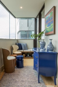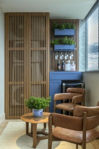O espaço ainda recebeu uma adega e um banco sob medida. A cor escolhida para o espaço foi o azul, trazendo paz e inspirado em um dos quadros da coleção de obras de arte do casal.